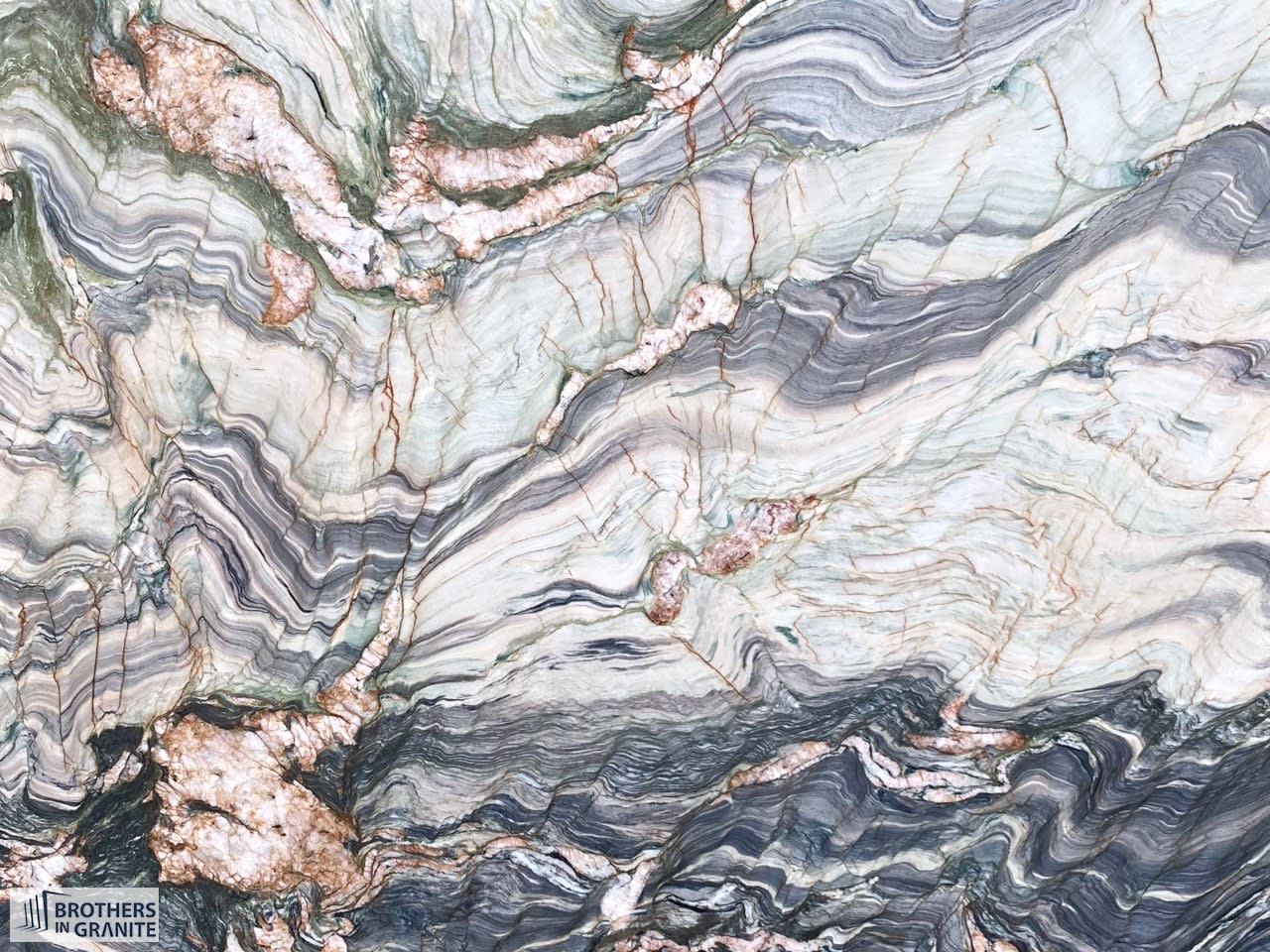 Blue Fusion is a Brasilian quartzite feauting an exotic cloudy pattern of blue grey green and.
